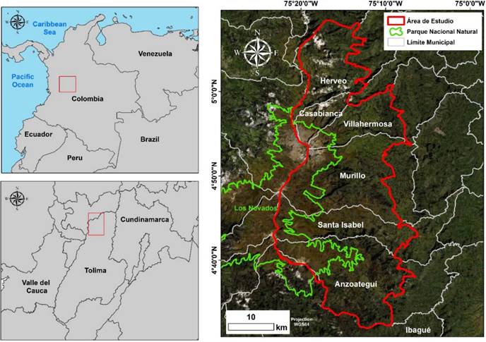 El Parque Nacional Natural Los Nevados (PNNN) está situado en la Cordillera Central colombiana (Figura 1). La zona incluye 239 km2 del área natural protegida en jurisdicción del departamento del Tolima. Adicionalmente, esta área incluye la zona amortiguadora de seis municipios aledaños desde una altitud de 2 500 m s. n. m. En total con la zona amortiguadora, el área de estudio posee una extensión de 1 250 km2, donde se presentan temperaturas que oscilan en promedio en 13.12 °C y posee precipitaciones bimodales con dos periodos lluviosos entre abril-mayo y octubre-noviembre superiores a los 2 000 mm/año (Avellaneda-Torres y Torres-Rojas, 2015; Parques Nacionales Naturales, 2017).