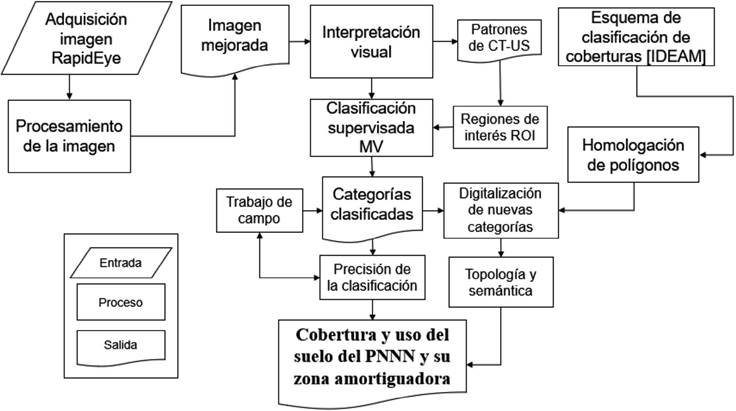 La metodología aplicada en este estudio (Figura 2) incluyó técnicas de procesamiento digital de imágenes, interpretación visual de CT-US, clasificación supervisada, trabajo de campo, la validación, la homologación del esquema de clasificación de coberturas para Colombia y ajuste del mapa final a escala 1:25 000. Para el procesamiento digital y el análisis de la imagen RE se utilizó el software ENVI 5.1 y para el manejo del sistema de información geográfica-SIG se usó el software ArcGIS 10.3.