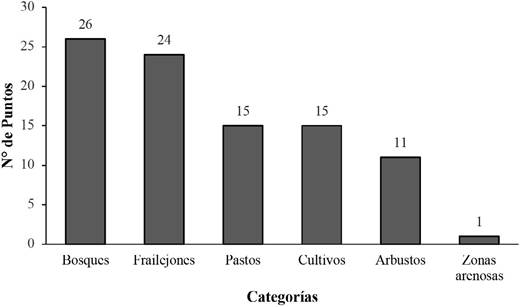 La validación en campo de los patrones clasificados mediante el MV se realizó durante los meses de agosto, septiembre y octubre de 2014. Se visitaron 92 puntos de reconocimiento (Figura 4) donde se identificaron las áreas con alguna incertidumbre en el resultado de la clasificación supervisada, debido a que la separabilidad espectral de varias categorías (Ej. bosques vs arbustos y cultivos vs pastos) fue compleja, esto se comprobó utilizando las firmas espectrales de cada categoría.