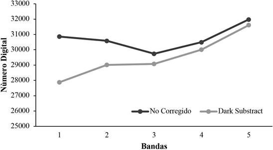 El ajuste radiométrico se aplicó a los números digitales (ND) de la imagen RE, utilizando las herramientas de ajuste de ENVI y el método "Dark Subtract". Este proceso elimina los efectos de dispersión atmosférica presentes en la imagen al minimizar los errores radiométricos en el momento de la captura y así mejora los elementos radiométricos de la superficie terrestre.