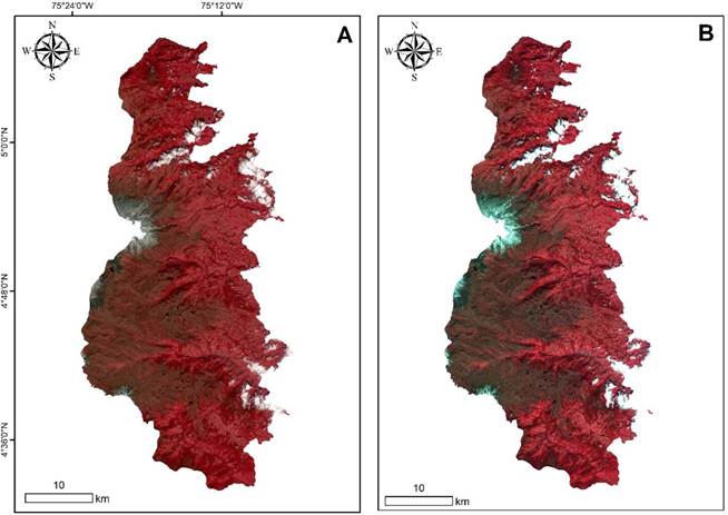 El contraste y la nitidez de las imágenes se mejoraron mediante la manipulación del histograma con un ajuste a cada banda mediante una desviación estándar. Además, en este estudio, para calcular las áreas se usó el sistema oficial de coordenadas proyectadas Magna Sirgas para Colombia (ESPG: 3116).