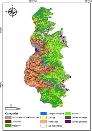 Se obtuvo la clasificación supervisada de las categorías que se interpretaron (Figura 9), por ejemplo, la distribución de bosques (en verde oscuro), la distribución de páramos (en rosa) y afloramientos rocosos (en gris) en zonas de alta montaña. Un aspecto importante en la clasificación fue la separación de las nubes (color púrpura) y las sombras (blanco), ya que estas presentaban cierta confusión en la clasificación de las categorías, principalmente con las zonas glaciares y algunos bosques o arbustos que en su momento, mostraron similitud en la reflectancia de los píxeles.