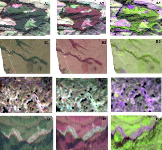 A partir del trabajo de campo, también se observó que los bosques presentaron diferentes densidades en la continuidad de la cobertura y variaciones en el dosel; se identificaron bosques intervenidos selectivamente en el área de estudio. Sin embargo, su estructura original no fue alterada del todo y fue necesario incluirlos dentro del esquema de clasificación de coberturas (Figura 10 A1-A3). De la misma manera, se encontró una cobertura vegetal predominante en el área que sigue la continuidad de los flujos de agua como ríos y representó un patrón repetitivo sobre el área de estudio (Figura 10 B1-B3).