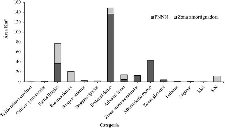 De igual forma, este estudio identificó en la zona amortiguadora y la conformación de amplias zonas de pastos limpios, lo que se traduce en el desarrollo actividades agropecuarias de alta montaña en zonas colindantes al PNNN, que traen consigo una presión adicional al ecosistema. Estas zonas han sido afectadas, principalmente, por la cría de ganado y la agricultura (Erazo, 2011). Por otra parte, se detalló gran cantidad de herbazales y bosques densos, coberturas naturales que juegan un papel fundamental en la prestación de servicios ecosistémicos y hacen parte del patrimonio natural de la región.