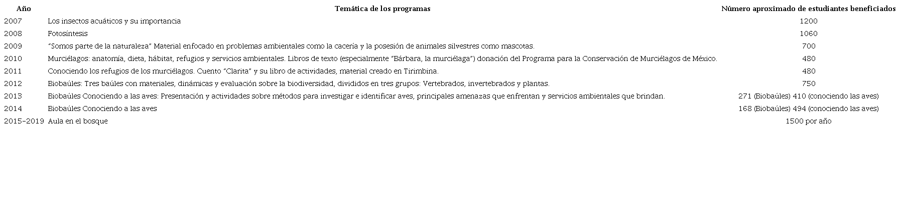 Cabe resaltar que uno de los temas más icónicos en los programas de educación ambiental de Tirimbina han sido los relacionados con murciélagos, que surgieron por el trabajo del Dr. Bernal Rodríguez Herrera en la reserva y su relación con los Programas de Conservación de Murciélagos en México y, posteriormente, la réplica de esa iniciativa en Costa Rica (Rodríguez et al., 2002). Como resultado de estas y otras iniciativas, se produjeron materiales educativos sobre murciélagos a nivel local, entre los cuales hay folletos de actividades y hasta un libro de cuentos que generaron resultados muy interesantes en la comunidad local .