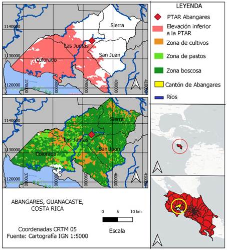 El cantón de Abangares se ubica al este de la provincia de Guanacaste, Costa Rica; presenta una altitud promedio de 175 m s.n.m. (con elevación mínima de 0 m y máxima de 1 350 m) y extensión territorial de 675 km2, y población de aproximadamente 20 200 habitantes. Como se observa en la Figura 1a, el cantón está conformado por los distritos de Las Juntas, Colorado, San Juan y Sierra; la cabecera del cantón de Abangares es Las Juntas, con una altitud promedio de 150 m s.n.m., una extensión territorial de 229 km2 y población de aproximadamente 10 000 habitantes, lo cual representa aproximadamente el 50 % de la población del cantón de Abangares (INDER, 2015).