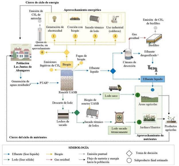 Como se observa en la Figura 2, se consideró el tratamiento anaeróbico de las aguas residuales del núcleo de población de Las Juntas de Abangares por medio de un reactor anaeróbico de manto de lodo de flujo ascendente (UASB, por sus siglas en inglés), el cual trataría el agua residual de 10 000 habitantes, correspondiente a la población de Las Juntas de Abangares. El sistema de tratamiento corresponde a una PTAR propuesta para e cantón de Abangares, no corresponde a una PTAR existente. Se consideró que los subproductos que se generen pueden ser aprovechados en el cantón de Abangares, el cual incluye otros núcleos de población además de Las Juntas. El modelo de gestión circular consideró el aprovechamiento de los subproductos de tres fases del reactor anaerobio: efluente líquido para reúso agrícola (fase líquida), lodo deshidratado en lecho de secado para uso agrícola (fase sólida) y biogás para aprovechamiento energético (fase gaseosa).
