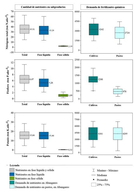 En la Figura 3 se observa que la cantidad de nitrógeno, fósforo y potasio presentes en la fase líquida es de entre 25.0 a 41.5 ton·año-1; 3.98 a 6.60 ton·año-1 y 11.6 a 19.2 ton·año-1 (en 75 % de las simulaciones), respectivamente. En la fase sólida, la cantidad de los tres nutrientes: nitrógeno, fósforo y potasio, es de entre 1.68 a 2.68 ton·año-1, 0.73 a 1.47 ton·año-1 y 0.22 a 0.41 ton·año-1 (en 75 % de las simulaciones). Por lo tanto, la cantidad total de nitrógeno, fósforo y potasio en los subproductos, incluyendo la fase líquida y sólida es de 27.2 a 43.7 ton·año-1, 5.10 a 7.76 ton·año-1 y 11.9 a 19.6 ton·año-1 (en 75% de las simulaciones), respectivamente.
