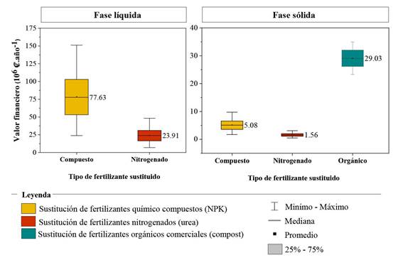 En la Figura 4 se presenta el potencial financiero derivado del ahorro de la sustitución de una fracción de la demanda de fertilizantes químicos de las áreas cultivadas con pastos, reemplazando los fertilizantes químicos con la fase líquida (efluente del reactor UASB) y fase sólida (lodo deshidratado) generadas en la PTAR.