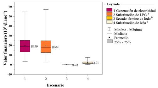 La Figura 5 muestra que el escenario 1 de producción de electricidad daría el mayor potencial financiero a la comunidad, con un valor entre ₡ 13.4 y 25.1 millones al año (US$ 21.2 a 39.8 miles al año) para el 75 % de las simulaciones, seguido de cerca de la opción de sustitución de LPG para cocinar, con un ingreso potencial de ₡ 12.5 a 24.8 millones al año (US$ 19.8 a 39.4 miles al año).