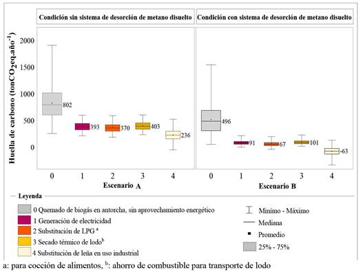 La estimación de la huella de carbono consideró cada uno de los escenarios mencionados en el párrafo anterior (para el aprovechamiento del biogás), cuantificando la reducción de emisión de carbono debido a la sustitución de las distintas fuentes de energía. Para calcular la huella de carbono neta de la PTAR, ese valor fue sustraído de la huella de carbono producida por la suma de las distintas fuentes de emisión de metano (CH4) de la PTAR (Brandt et al., 2018): CH4 disuelto en el efluente anaerobio, emisiones fugitivas de CH4 en el decantador del reactor UASB, fugas de biogás en el separador trifásico y emisiones puntuales debido a una eficiencia limitada de combustión en la antorcha en caso de no aprovechamiento energético del biogás. En relación con el CH4 disuelto en el efluente anaerobio, se valoraron dos casos: (i) envío del efluente anaerobio directamente al área de irrigación agrícola sin ningún tratamiento previo (escenario A) y (ii) uso de una técnica de remoción de gases disueltos (cámara de desorción) con posterior oxidación biológica del gas residual en un biofiltro (escenario B) (Brandt et al., 2019). De este modo se reduciría sustancialmente la emisión no controlada de CH4 desde el efluente anaerobio hacia la atmósfera durante su transporte hacia el área agrícola.