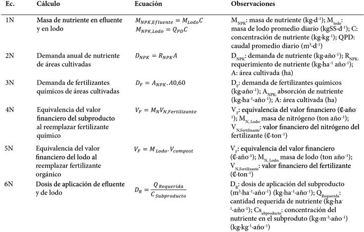 Por otro lado, se estimó la cantidad anual de nitrógeno, fósforo y potasio absorbida por las áreas cultivadas del cantón de Abangares, considerando el tipo de cultivos presentes en la zona; se incluyeron cultivos permanentes, tierras de labranza y pastos (INEC, 2015). La cantidad de fertilizantes químicos utilizados en la zona fue establecida como el 60 % de la cantidad de nutrientes absorbidos por las áreas cultivadas; debe considerarse que, en Costa Rica, aproximadamente en un 60 % de las áreas cultivadas son utilizados este tipo de fertilizantes (INEC, 2015). De esta forma, fue posible determinar la demanda de nutrientes en cultivos de pastos que normalmente es abastecida con fertilizantes químicos. Con estas informaciones fue posible comparar la cantidad de nutrientes presente en los subproductos generados durante el tratamiento de aguas residuales con la cantidad de nutrientes necesarios para el crecimiento de los cultivos de pastos del cantón, con indicaciones de la fracción de fertilizantes químicos que podría ser sustituida por medio del reúso de los subproductos. En el Cuadro 3 se presentan las ecuaciones utilizadas para realizar los cálculos mencionados.
