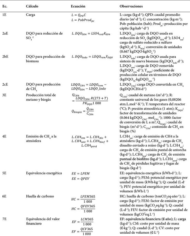 Para los cálculos de generación de energía y huella de carbono se consideraron balances de masa y energía basados en la carga de DQO del agua residual cruda y sus rutas de conversión en el reactor anaerobio, tomando en cuenta las especificidades de cada uno de los escenarios y tratamientos específicos mostrados en la Figura 2. El Cuadro 4 muestra las ecuaciones utilizadas para esta etapa del estudio.