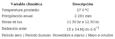 En cuanto a los regímenes de lluvias, los niveles de precipitación abarcan desde 1 400 mm·año-1 en las zonas moderadamente secas que se ubican a menor altitud y hasta 2 281 mm·año-1 en las zonas más húmedas y de mayor elevación. Respecto a la temperatura, el promedio anual varía entre 21.4 ºC y hasta 32.6 ºC en las zonas de menor altitud (INDER, 2015). En el Cuadro 1 se presentan las principales variables climáticas del cantón de Abangares.