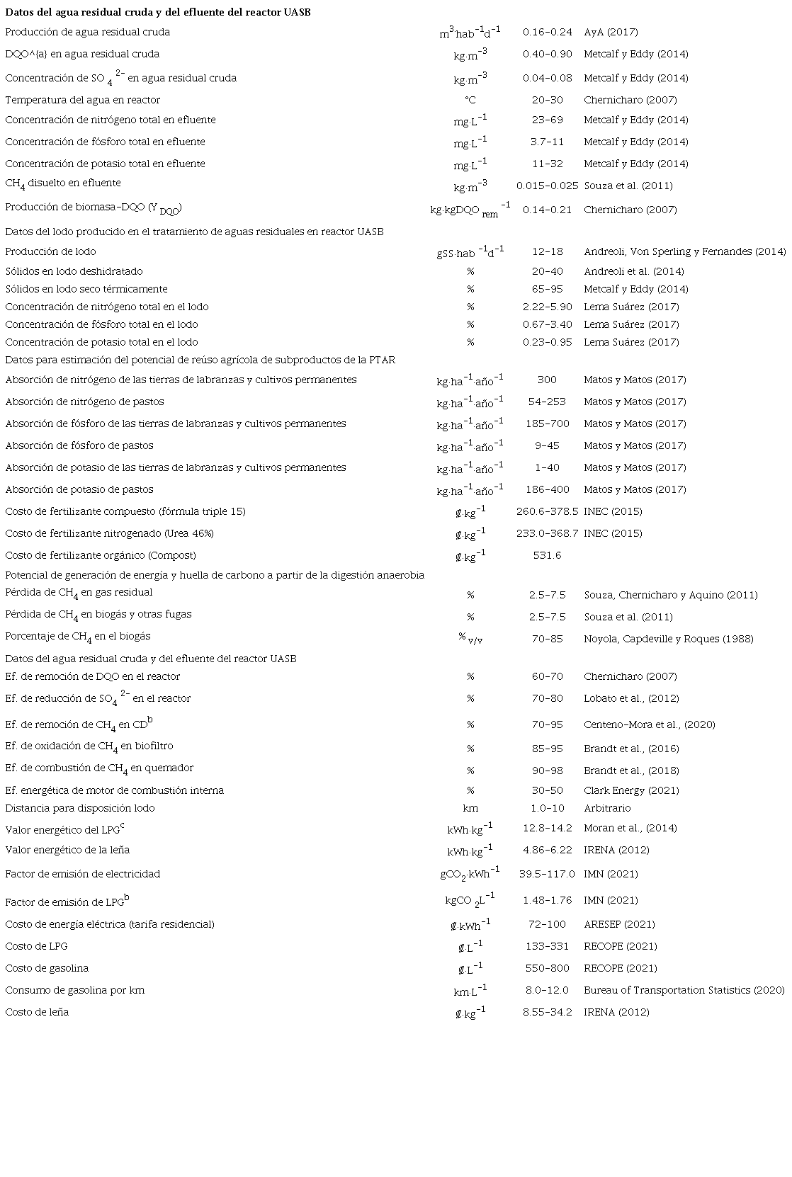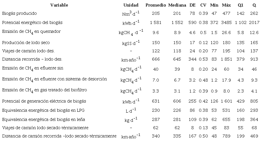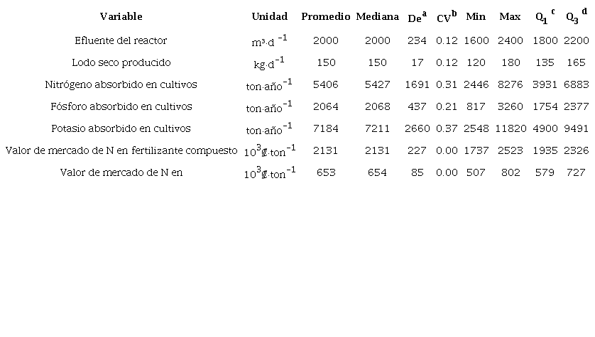 Aunque para la mayoría de los parámetros de entrada fueron utilizados rangos de variación (Cuadro 2), algunos otros fueron considerados constantes. Los parámetros del modelo estimados como constantes fueron: la población de Las Juntas de Abangares (10 000 habitantes), el potencial de efecto invernadero del CH4 considerado como 28 kgCO2eq·kgCH -1 en un plazo de 100 años (IPCC, 2021), el valor energético del CH4 de 9.97 kWh·Nm-3 (Moran et al., 2014), el factor de emisión (FE) del transporte de carga de 0.9 kgCO2eq·km-1, el FE de la quema de leña de 1.64 kgCO2eq·kg-1 (International Energy Agency, 2018) y la capacidad del camión de transporte de lodo deshidratado o secado térmicamente de 2 toneladas (valor arbitrario). Adicionalmente, algunos parámetros de uso del suelo del cantón de Abangares, utilizados durante la interpretación de los resultados, fueron: el área cultivada de tierras de labranzas (1 071.35 ha), el área cultivada de cultivos permanentes (1 809.19 ha) y el área cultivada de pastos (29 298.79 ha), según el INEC (2015).