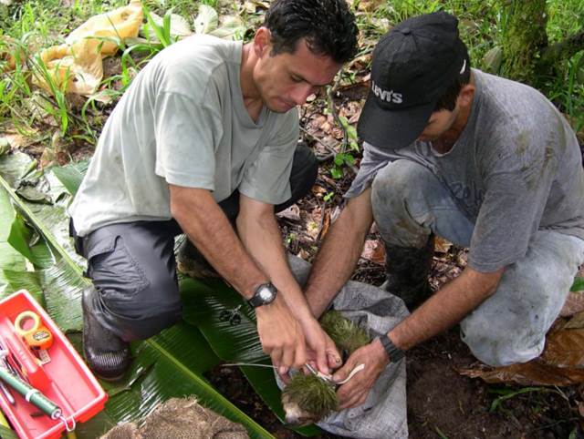 Según los trabajadores del cacaotal y nuestro inventario (Vaughan et al., 2002), B. variegatus y C. hoffmanni estaban entre las especies de vida silvestre más grandes y comunes observadas dentro de los cacaotales de Costa Rica y alrededor de estos. Como coordinador, presenté el anteproyecto al Ministerio del Ambiente y Energía de Costa Rica (MINAE) y fue aprobado el 1 de febrero de 2004. Decidí trabajar con radio-telemetría, tal como habíamos hecho con otros mamíferos. Estudiamos inicialmente la ecología espacial de las dos especies de perezosos, o sea el uso del hábitat, los árboles preferidos para descansar, la dieta, los movimientos, y el área de distribución a partir de FINMAC. También, para aprovechar las capturas y tomar datos de salud de los perezosos, invité a participar a veterinarios de vida silvestre de las UWMEVS y UNAEVS.