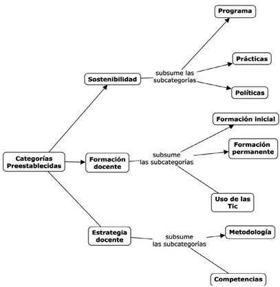 Para desarrollar y facilitar el análisis de la información se establecieron, a priori, es decir, construidas a partir de una primera revisión teórico-conceptual 3 categorías abarcadoras: i) Sostenibilidad; ii) Formación docente y iii) Estrategia pedagógica. En la Figura 1 se explicitan cada una de estas con sendas subcategorías.
