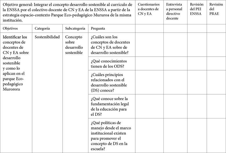 Adicionalmente, se aplicó un cuestionario semiestructurado con 18 preguntas abiertas, organizado por categorías y subcategorías, validado por 5 personas expertas, a quienes se les entregó una carta y formatos donde se detallaron los propósitos del cuestionario y se explicitaron las tres categorías: sostenibilidad, formación docente y estrategias pedagógicas, las cuales tributan a la temática central de la investigación sobre desarrollo sostenible. Seguidamente, se les solicitó efectuar las observaciones, aportar las sugerencias a su juicio pertinentes y tomar en cuenta en el análisis de los ítems elementos como: i) pertinencia entre los ítems y los propósitos propuestos, ii) correspondencia entre las categorías y subcategorías y iii) relación lógica, lenguaje y redacción apropiada. Asimismo, se diseñaron rúbricas para la revisión documental del corpus constituido por los documentos PEI, PRAE y propuestas curriculares de la asignatura de CN y EA, instrumentos validados también por el mismo grupo experto.