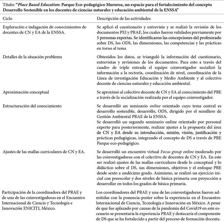 La investigación acción constituyó un diseño pertinente para desarrollar la intervención socioeducativa en la ENSSA en la medida que la interacción e involucramiento del equipo coinvestigador y participantes mediante la propuesta “Place Based Education: Parque Eco-pedagógico Muroroa, un espacio para el fortalecimiento del concepto desarrollo sostenible en docentes de ciencias naturales y educación ambiental posibilitó sensibilizar a este colectivo sobre la necesidad de fortalecer la integración del concepto de DS y objetivos de desarrollo sostenible en el PEI, PRAE y planes de área, en general, en el currículo escolar, de forma significativa.