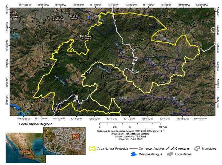 La zona de protección ambiental PALE, decretada en el año 2011 por el gobierno del Estado de Michoacán de Ocampo; se localiza al Sureste de la capital del Estado, entre las coordenadas geográficas: 19° 39' 48.522'' y 19° 30' 31.325'' de latitud Norte y los 101° 12'24.765'' y 100° 56' 48.567'' de longitud Oeste, comparte territorio de los municipios Morelia, Charo y Madero (Figura 1). Esta ANP, es parte del Sistema Estatal de Áreas para la Conservación del Patrimonio Natural de Michoacán, administrada por la Secretaría de Medio Ambiente, Cambio Climático y Recursos Naturales, con un esquema de protección, preservación, conservación y restauración. Es una de las principales ANP del Estado de Michoacán, con 231.07 km2 de extensión. De gran importancia por representar una fuente potencial de recursos hídricos para la región, principalmente para la ciudad de Morelia (Instituto Nacional de Geografía y Estadística (INEGI), 2017).