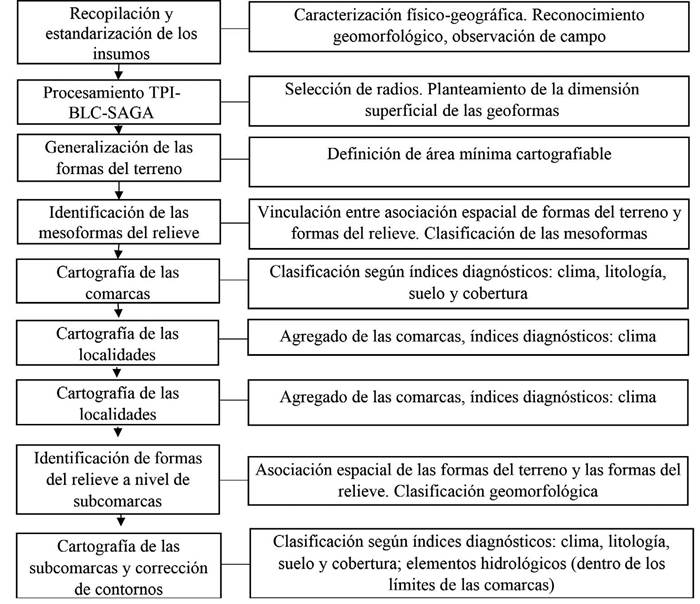 El procedimiento con la herramienta TPI-BLC del SAGA consiste en sintetizar la información geomorfológica del área, la selección de los radios, la interpretación de las formas del terreno y la delimitación y clasificación de las geoformas. Según los índices diagnósticos de la clasificación tipológica, las mesoformas del relieve definen las comarcas f-g. Son las primeras que se identifican y clasifican a partir de la asociación espacial de las formas del terreno, continuación, se sintetiza la información relativa a los índices diagnósticos: régimen de humedad, litología, suelos y vegetación. Las localidades-g se cartografían por asociación de las comarcas, diferenciándose por los datos de las asociaciones litológicas y la génesis del relieve. Las subcomarcas f-g, se identifican cuando se distinguen los elementos o partes de las mesoformas que definieron a las comarcas, para ello se utilizan las categorías generadas por TPI-BLC al interior de las mesoformas.