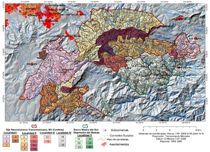 La clasificación de los paisajes a nivel local (1: 50 000) se conforma por tres niveles de unidades taxonómicas: localidad, comarca y subcomarca f-g (Mateo 2011). Las unidades se delimitan a partir de una taxonomía estructurada en una ordenación jerárquica y anidada, en la que los paisajes se identifican sobre la base de elementos indicadores y factores diferenciadores que determinan el comportamiento y distribución de los componentes naturales, y dan lugar a áreas relativamente homogéneas y repetibles con rasgos comunes (Bocco et al., 2010).