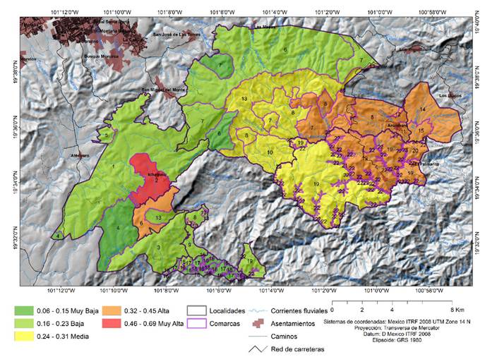 Las comarcas de esta categoría se caracterizan, de forma general, por pendientes medias, suelos de buena calidad para activades agropecuarias, una red fluvial con predominio de corrientes fluviales permanentes, presencia de asentamientos y viales de acceso, lo que se refleja en un alto índice de antropización inducido por la eliminación de los bosques de pino encino y encino fundamentalmente, para áreas dedicadas a la agricultura de temporal y cultivos perennes. Las comarcas con un muy alto índice de modificación antrópica se localizan al oeste del ANP (Figura 9), corresponden a la totalidad del polígono de la comarca 2 de la localidad f-g I, caracterizada por superficies planas a ligeramente inclinadas (0-5o), con remanentes de coberturas de bosques secundarios de pino encino con predominio de herbáceas y el predominio de extensas áreas dedicadas a la agricultura de temporal, permanente y pastizales. Se encuentran 7 polígonos de la comarca 22 en la localidad f-g V, formada por valles fluvio-denudativos, erosivos encajados, en forma de V, con laderas de ligeramente a muy fuertemente inclinadas (5-45o), y cauces con corrientes fluviales intermitentes, constituidos por andesita-brecha volcánica andesítica, con suelos luvisol crómico, feozem háplico y regosol éutrico, y coberturas de remanentes de bosques secundarios con predominio de herbáceas de pino encino y selva baja caducifolia y el predominio de pastizales inducidos.