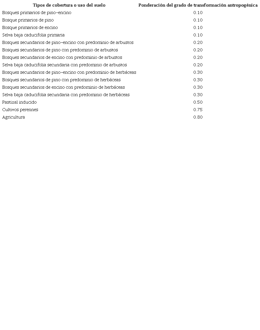 Para el cálculo del índice, la base constituye el mapa paisajes antroponaturales, con el marco establecido por Shishenko (1988). La metodología propuesta por el citado autor asigna a cada uso de suelo o cobertura vegetal contenidos en un polígono de paisaje un valor ponderado o peso relativo (0.01 a 0.99) según el grado de transformación que representa esa cobertura o uso. Se parte del principio de que si existe cobertura hay menor transformación antropogénica que cuando existe un uso, así se otorga el valor más bajo de ponderación a las coberturas menos degradadas y el valor mayor para los usos que originan una mayor intensidad de la antropización de la cubertura vegetal. Estos valores de ponderación permiten dar un peso relativo al proceso de antropización, diferenciando entre la vegetación natural (primaria), la vegetación antropizada (secundaria con predominio de arbustos o herbáceas), la vegetación cultural (cultivos y pastizales), y usos intensivos como la urbanización (Cuadro 1).