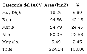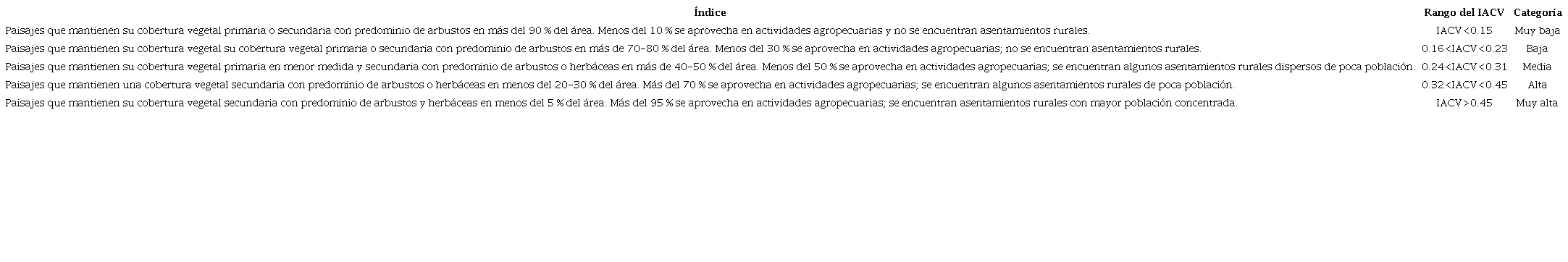 Acorde con el cálculo del IACV, se obtuvieron las siguientes definiciones y rangos del grado de antropización de la cobertura vegetal de los paisajes mediante el método de rompimiento natural en ArcGIS (Cuadro 2).