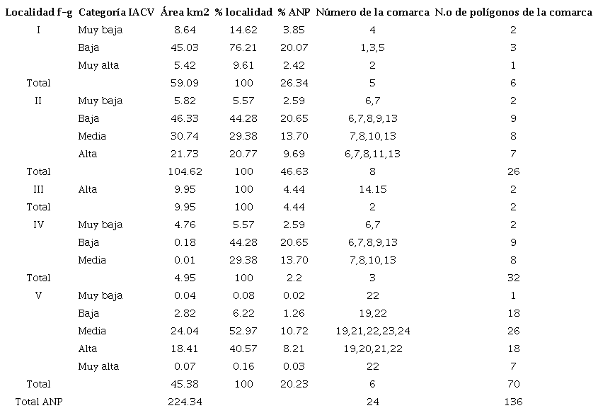 La categoría muy baja del IACV tiene superficies similares en las localidades f-g I a la IV, presente en tan solo 6 comarcas y 24 polígonos, de pequeña extensión, estas mismas deben ser observadas por ser las de muy poca modificación. La categoría media del índice solo se presenta en las localidades f-g II y V, en 10 comarcas y 24 polígonos con superficies extensas en su mayoría, representa territorios donde la modificación comienza a manifestarse de manera importante, es una categoría que merece atención en el sentido de tratar de detener los procesos que provocan la antropización. La categoría alta sigue la misma distribución que la categoría media, en las localidades f-g II y V con extensiones similares, se presenta en 9 localidades y 26 polígonos, en ellas las modificaciones ya son intensas, necesitan de medidas de restauración de la vegetación original, son paisajes donde se realizan las principales actividades económicas del ANP (Cuadro 2). Los paisajes muy modificados, que se corresponden con la categoría muy alta del índice, se presentan solamente en la localidad f-g I, en 1 comarca y un polígono, que se encuentra urbanizado y dedicado a actividades agropecuarias.