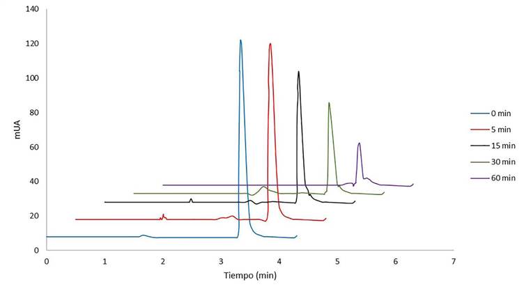 En los cromatogramas correspondientes a una solución de metilparabeno de 25µg/mL, es evidente un solo pico donde los tiempos de retención estuvieron entre 3.33 y 3.57 minutos y la pureza de pico de 999.95 % equivalente a 99.995 % para tiempo cero, disminuye hasta 975.25 % equivalente a 97.525 % (Cuadro1). El único pico de retención está indicando, posiblemente, la presencia de una sola sustancia mientras transcurre el tiempo de exposición del analito al tratamiento de luz UV y ozono, lo que permite interpretar que la lectura (λmax =256 nm) indica que los productos de degradación generados en la aplicación de la técnica no absorben o absorben a longitudes de onda diferentes a la de máxima absorbancia del fármaco. De otro lado, a medida que aumenta el tiempo de exposición del fármaco a la radiación ultravioleta y el ozono, la concentración de la sustancia se reduce. Esto se refleja en la disminución de la altura del pico o el área de este. Se observa, además, que, el metilparabeno presenta una degradación aproximada del 91 % durante los 60 minutos de exposición al tratamiento, calculados según la Ecuación 1: