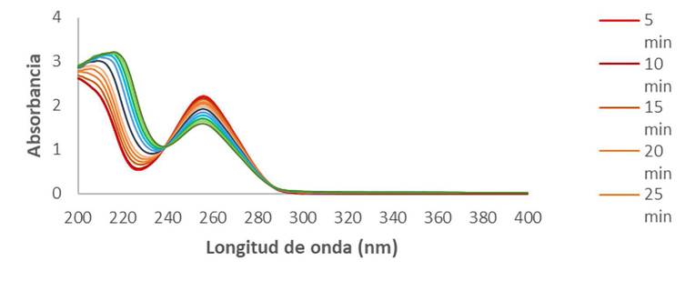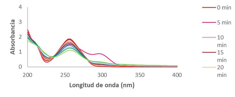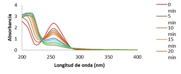 Se observa que la absorbancia a la longitud de onda máxima (λmax =256 nm) disminuye respecto al tiempo de exposición, confirmándose así una degradación en esta sustancia. Los porcentajes de degradación fueron calculados (Ecuación 1) encontrándose un porcentaje del 47.31 % para el fármaco estudiado, al minuto 90 de exposición a la técnica UV.
