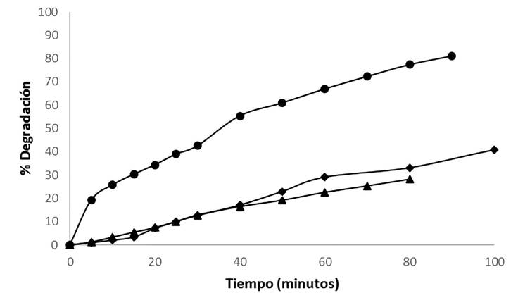 En la degradación del fármaco en estudio en función de la técnica, se realizó una gráfica con el fin de identificar y analizar los porcentajes de degradación calculados (Ecuación 1), respecto al tiempo de exposición del metilparabeno.