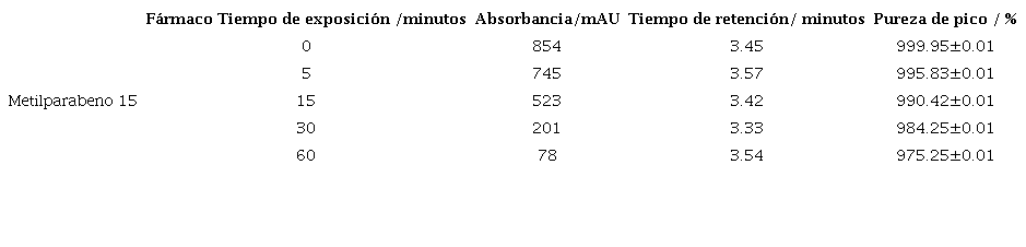 Condiciones CLAE-DAD (cromatografía líquida de alta eficiencia con dispositivo de arreglo de diodos) (Delgado et al., 2014): se empleó un cromatógrafo líquido modular Agilent 1200 Series, con automuestreador Agilent 1260 Infinity, desgasificador Agilent 1200 Series, bomba cuaternaria Agilent 1200 Series, detector UV/VIS con arreglo de diodos e integrador Agilent 1200 Series, así como una columna eclipse XDB-C18 (150 mm x 4.6 mm, 3.5-5 µm) cuya temperatura de operación fue de 25 °C. El volumen de inyección fue de 10 µl (solución de 25 μg / mL); la fase móvil utilizada fue sistema de gradiente lineal de dos solventes agua/acetonitrilo, ambos con ácido trifluoroacético (TFA) al 0.05 % cuya composición de partida fue 90/10 a cero minutos, luego se cambió a 85/15 a los diez minutos. La velocidad de flujo fue de 2.5 ml/min, y la longitud de onda empleada para la cuantificación fue de 256 nm para el metilparabeno; con un ancho de pico de 0.1 minutos, en un rango de escaneo de 190 a 400 nm y un ancho de banda de 1.0 nm con una apertura (slit) de 2 nm. Una vez realizados los diferentes ensayos experimentales, se concluye que los productos de degradación generados por la exposición del fármaco a radiación ultravioleta y ozono no absorben a la longitud de máxima absorbancia del analito. Conforme a lo anterior, la metodología analítica UV/Vis puede ser empleada para el análisis de gradación de la sustancia en estudio. De otro lado esta metodología tiene ventajas en cuanto a la reducción de residuos contaminantes y tiempo de análisis.