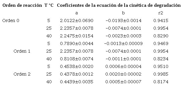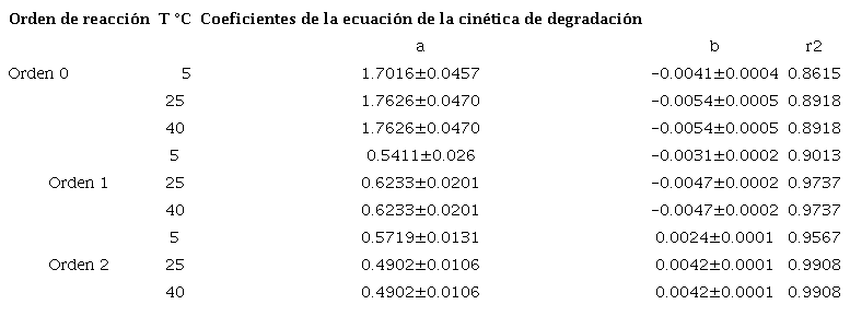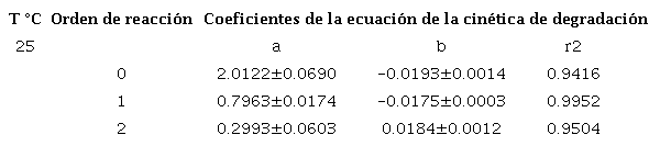 Referente al estudio de la cinética química, fueron evaluadas las técnicas de UV y ozono a diferentes temperaturas de 5 °C, 25 °C y 40 °C, para analizar, en función de esta variable, cuál podría presentar mayor degradación, teniendo en cuenta que la temperatura podría afectar la velocidad de las reacciones al aumentar la energía cinética de las moléculas que interfieren en el proceso de degradación de un fármaco. Conforme con los resultados obtenidos, donde a 25 °C se encontraron los mejores porcentajes de degradación para la sustancia en estudio, respecto a las tres técnicas evaluadas; la técnica combinada se llevó a cabo únicamente a temperatura de 25°C. Para identificar el orden de la cinética de degradación del metilparabeno se utilizó el método gráfico, y se obtuvieron los coeficientes de correlación (Cuadros2,3 y4).