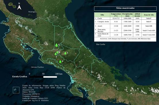 Las plantaciones evaluadas se ubican en las provincias Cartago (Santa María de Dota), Heredia (Barva y San Rafael) y San José (Aserrí y Acosta), Costa Rica. Las características biofísicas de los sitios se presentan en la Figura 1.