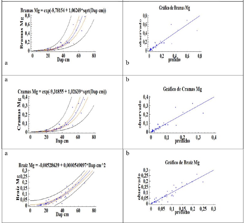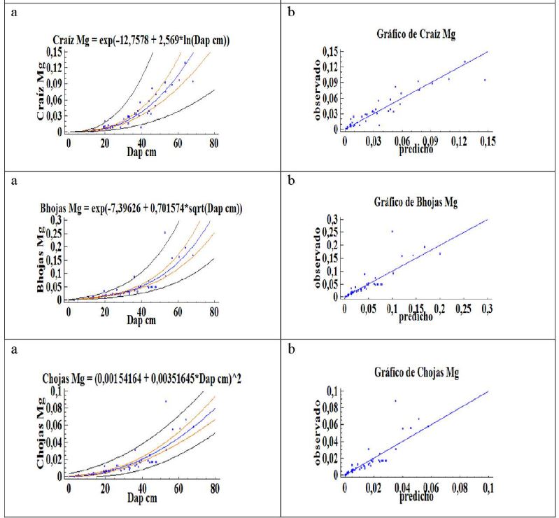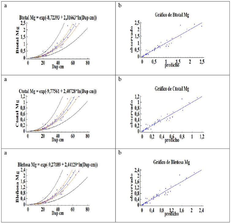 En el Cuadro 3y la Figura 1a, se muestran los modelos seleccionados para cada uno de los componentes y para el árbol completo; presentan buen ajuste, con coeficientes de determinación (R2) superiores a 83.8 %; el menor ajuste fue para el carbono en follaje y para la biomasa y el carbono en la raíz. El R2 en los otros varió desde 91.1 % (B y Cramas) hasta 97 % (Btotal). En todos los casos, los parámetros de la regresión fueron significativos (α = 0.05), lo cual indica que el diámetro presenta una correlación alta (R > 0.96) con la biomasa y el carbono. La precisión de los modelos evaluada con el RCME y el EMA (criterios de bondad de ajuste), los valores más altos fueron 0.49 y 0.36, respectivamente, y correspondieron al componente raíz.