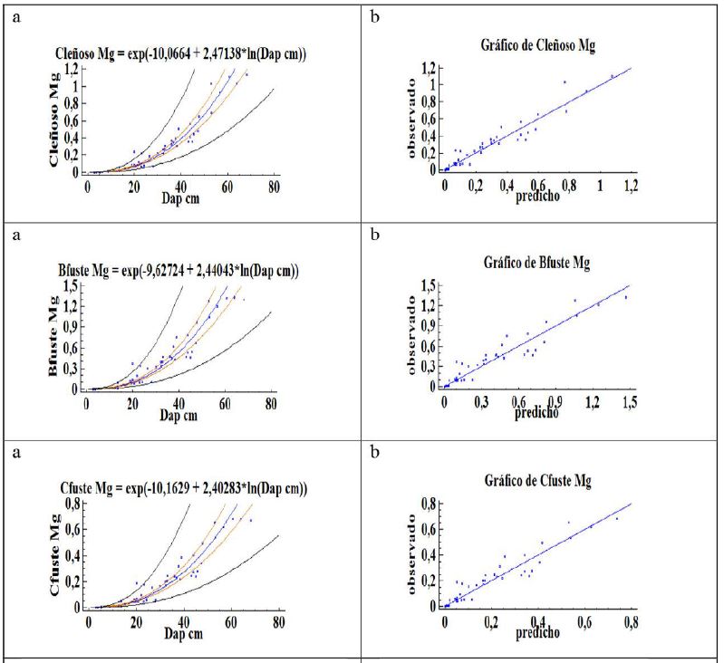 En los modelos probados y elegidos, desarrollados a partir de la regresión simple, se utilizó como variable predictora el diámetro normal, porque ha demostrado alta correlación con la biomasa del árbol y de sus componentes (Gutiérrez y Flores, 2019; Jiménez et al., 2018), hecho que lo convierte en la variable más utilizada, con excelente predicción en variedad de estudios en gimnospermas (Gutiérrez y Flores, 2019) y angiospermas en plantación (Fonseca et al., 2021a; Fonseca et al., 2021b; Jiménez et al., 2018; Montes de Oca, 2020), en sistemas silvopastoriles (Jiménez et al., 2019) o en bosque natural (Chou y Gutiérrez, 2013; Fonseca et al., 2019; Fonseca et al., 2020). Además, tiene la ventaja de que su medición es sencilla, precisa, objetiva y el equipo usado para realizarla es simple y económico, si se compara con la medición de la altura o de otras variables del árbol.