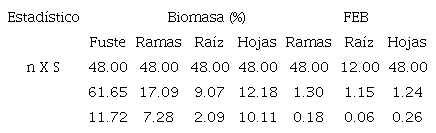 El fuste, en promedio, acopió el 61.7 % de la biomasa total del árbol, le siguen las ramas, la raíz y las hojas. En todos los componentes, la variabilidad (S) fue inferior a 11.7 kg*árbol (Cuadro 2). El FEB para incluir la biomasa del follaje, las ramas y la raíz fue similar para los componentes leñosos, con 1.3 y 1.24 para ramas y raíz, respectivamente, y 1.15 para el follaje. Aquí también la desviación o variabilidad (S) es bastante baja, con un máximo de 0.26 en las hojas (Cuadro 2).