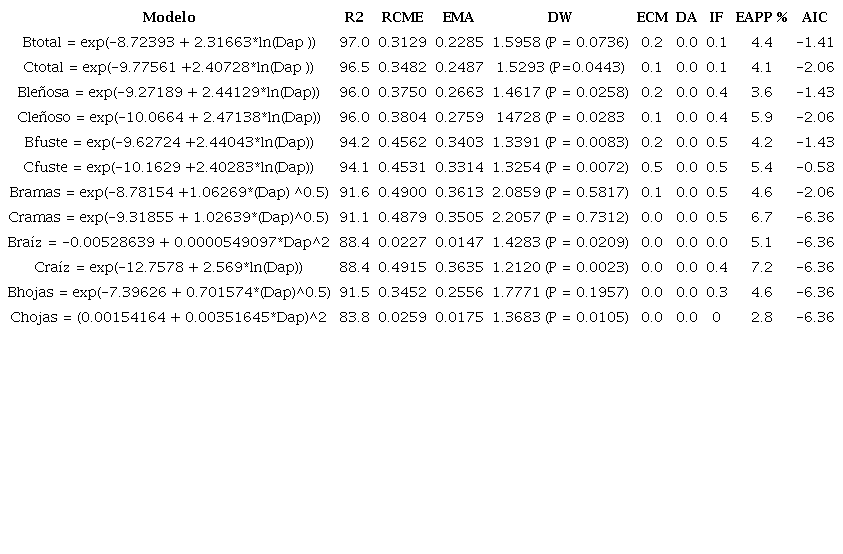 El R2 y los demás descriptivos alcanzados en este estudio, para el árbol completo (incluida la raíz) y todas las fracciones (Cuadro 3), usando únicamente el diámetro como variable predictora, es igual o superior al reportado en otras pesquisas que han modelado la biomasa a partir de más variables (diámetro, altura y densidad de la madera), lo que supone una mejoría en el ajuste (Cortés et al., 2019; López et al., 2018; Puc et al., 2019).