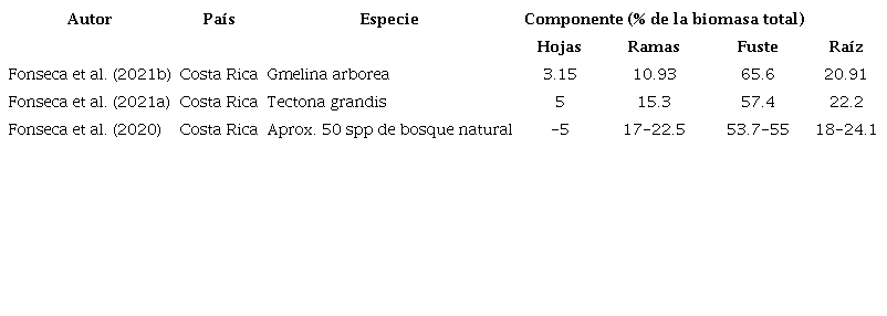 50.7 %, así como más bajos en las ramas (48.9 %) y en el fuste (49.9 %). Fonseca et al. (2021a), en Tectona grandis, determinaron valores similares en los componentes leñosos (ramas-fuste-raíz), que variaron de 44.9 y 45.7 % y de 40.7 % en las hojas.