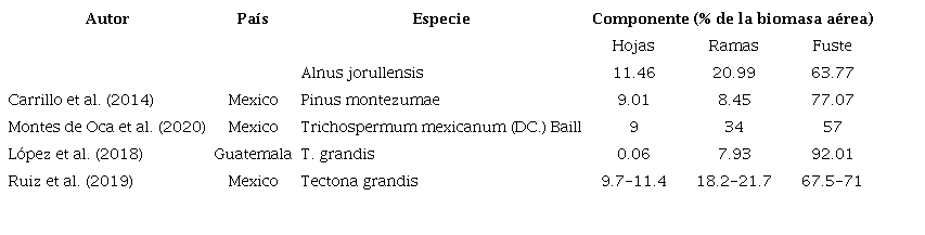El fuste de C. lusitanica en esta investigación acumuló el 61.6 % de la biomasa total (incluida la raíz), las ramas el 17.1%, la raíz y las hojas con 9.1 y 12.2 %, respectivamente. Tales cifras están en el rango reportado en la literatura (Cuadro 4) y manifiestan la misma tendencia para la mayoría de las gimnospermas y angiospermas, aunque pueden presentarse variaciones que obedecen a las características entre las especies, al sitio, a la edad de la plantación y al grado de manejo (Aquino et al., 2015; Forrester et al., 2017). La concentración de biomasa en el fuste se debe a que, conforme el árbol se desarrolla, asigna más recursos hacia madera y ramas, para promover el crecimiento en altura y de la copa, con el fin de aumentar la competencia por la luz (Mensah et al., 2016). En otros trabajos, se reporta porcentajes de biomasa en el fuste más altos, porque son calculados sobre la biomasa aérea, es decir, no evaluaron el componente raíz (Cuadro 5).