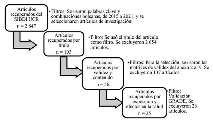 Se procedió a leer el título de cada artículo y seleccionar los que eran acordes con los objetivos de esta indagación. Para este punto, se recuperaron 193 artículos a los cuales se les aplicó el filtro de validez y contenido (resumen, resultados y conclusiones de cada publicación); de forma complementaria, se aplicó la evaluación GRADE a los artículos que, según su diseño, se podían emplear; se recopilaron 56. En el presente documento, se muestran los artículos que abordan el tema de la exposición, con base en las concentraciones de Hg y los efectos en la salud que anotan evidencia cuantitativa, último filtro en el que se obtuvieron 25 artículos.