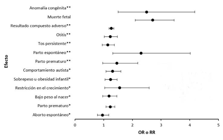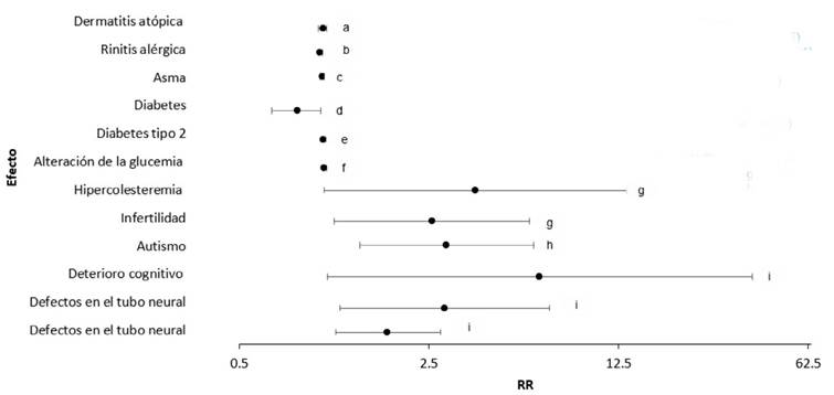 La Figura 3 muestra que no se reporta un alto exceso de riesgo de dermatitis atópica, rinitis alérgicas, asma, diabetes y alteración de la glucemia. Se encontraron efectos asociados con la hipercolesterolemia, la infertilidad, el autismo, el deterioro cognitivo y los defectos en el tubo neural.