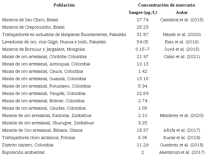 La caracterización de la exposición a Hg estuvo representada por un sector poblacional ocupacionalmente expuesto, con valores que sobrepasaron los niveles de referencia en sangre, a pesar de que no existe una homogenización para definir parámetros normales y anormales. Algunos de los valores significativos se documentaron en las lavadoras de oro, ríos Gilgit, Hunza e Indo, Pakistán (54.05 µg/L); mineros de Sao Chico (27.64 µg/L) y Creporizinho, Brasil (25.23 µg/L); trabajadores en industria de lámparas fluorescentes, Pakistán (31.87 µg/L); MAPE Córdoba (21.97 µg/L), Antioquia (10.13 µg/L), Guainia (13.16 µg/L) y Vaupé, Colombia (22.69 µg/L), y MAPE Bibiani, Ghana (18.37 µg/L). La mayoría de los artículos presentó datos de mineros de oro artesanal y otros estudios de trabajadores de cloro-alcalinos y lámparas fluorescentes. En estos estudios, los participantes, en general, informan sobre problemas cognitivos, malestares como dolor de cabeza, fatiga, temblores, quemaduras en la piel, dolores en las articulaciones, problemas renales, trastornos de inhalación, entre otros.