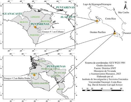El estudio se realizó en 2 ensayos establecidos por el Instituto de Investigación y Servicios Forestales de la Universidad Nacional (INISEFOR-UNA), en la provincia de Puntarenas en Costa Rica (Figura 1). El primer ensayo se instaló en junio de 2014 en el Pacífico Norte, en el cantón de Puntarenas, distrito de Cóbano, localidad La Esperanza, entre las coordenadas geográficas 9°46’4.1” N y 85°07’11.4” O. El sitio pertenece a la empresa Cerital Corporation S. A. y, anteriormente estaba destinado a la ganadería extensiva. Este ensayo se ubica en un área levemente ondulada (≤ 10 % de pendiente) y los suelos son de orden alfisol, caracterizados por su buena fertilidad (INTA, 2015a). El sitio se encuentra a 134 m s. n. m., la precipitación en la zona es de 2 000 a 3 000 mm anuales y la temperatura media anual varía entre 26 y 28 °C (Da Cruz y Mahlich, 2018).