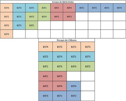 El diseño experimental consistió en el establecimiento de cinco bloques completos al azar con cuatro tratamientos de fertilización en cada uno de los ensayos (Cuadro 1, Figura 2). La densidad de árboles por hectárea fue de 625 individuos, mientras que la cantidad de árboles medidos por tratamiento fue de 25, en ambos casos se utilizaron los mismos clones superiores de melina.
