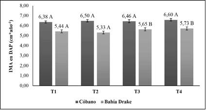 El IMA del DAP para los sitios de Cóbano y Bahía Drake fue de 6.5 y 5.5 cm año-1 respectivamente, la diferencia en promedio fue de un 15 %. En Cóbano no existieron diferencias estadísticamente significativas para el DAP, mientras que para Bahía Drake sí existieron diferencias entre el T1 y T2 con respecto al T3 y T4 (Figura 3). El mayor IMA se registró en el T4; es decir, que la fertilización continua y acumulativa hasta los 24 meses tiene un efecto positivo en el crecimiento diamétrico de los árboles.