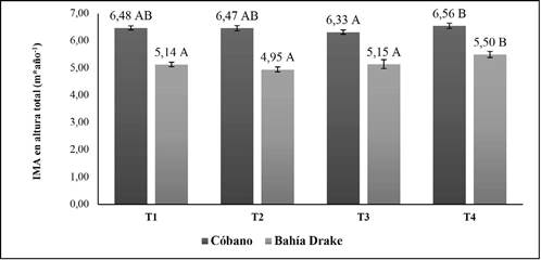 Con respecto a la altura total el IMA promedio fue de 6.5 m año-1 en Cóbano y 5.2 m año-1 en Bahía Drake. Al igual que el DAP, los mayores valores de IMA se obtuvieron en el T4, sin embargo, a diferencia del DAP, la altura total presentó diferencias estadísticamente significativas en ambos sitios (Figura 4). No obstante, en Cóbano las diferencias se dieron únicamente entre el tratamiento 3 y 4, por lo tanto, el efecto de la fertilización inicial (3 meses y 6 meses) no es significativo en un sitio que posee una alta fertilidad natural.