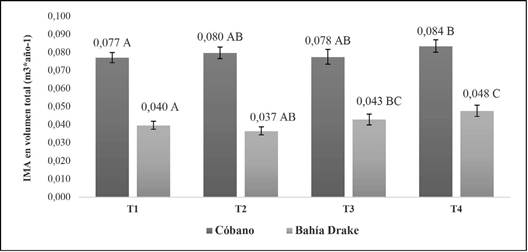 Para el volumen total por árbol se registraron diferencias estadísticamente significativas en ambos sitios. En el sitio de Bahía Drake se observaron entre el tratamiento T4, con respecto al tratamiento T1 y T3, además entre el tratamiento T2, con respecto al T3 (Figura 5). Estas diferencias permiten inferir que la incorporación de fertilizante a los 12 y 24 meses tiene efectos significativos en el crecimiento de G. arborea, en sitios con baja fertilidad natural. En el sitio de Cóbano, las diferencias estadísticamente significativas se registraron únicamente entre el tratamiento el T1 y el T4, presentando este último una superioridad de 0.006 m3 año-1, equivalentes a un 8 % más de IMA para el volumen total por árbol en comparación con el primer tratamiento.